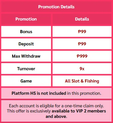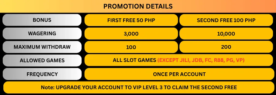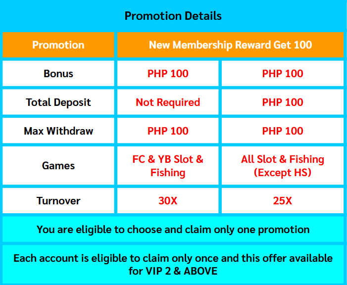 • Join One ​​promotion that members want to avail to get Free PHP100 available for VIP 2 and ABOVE