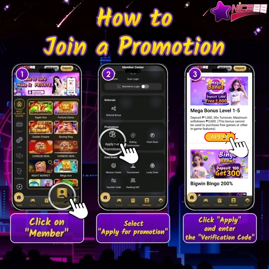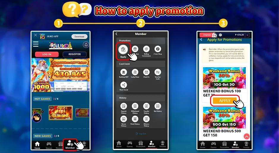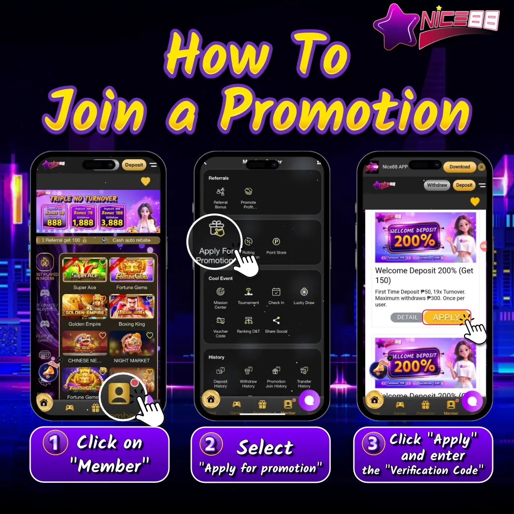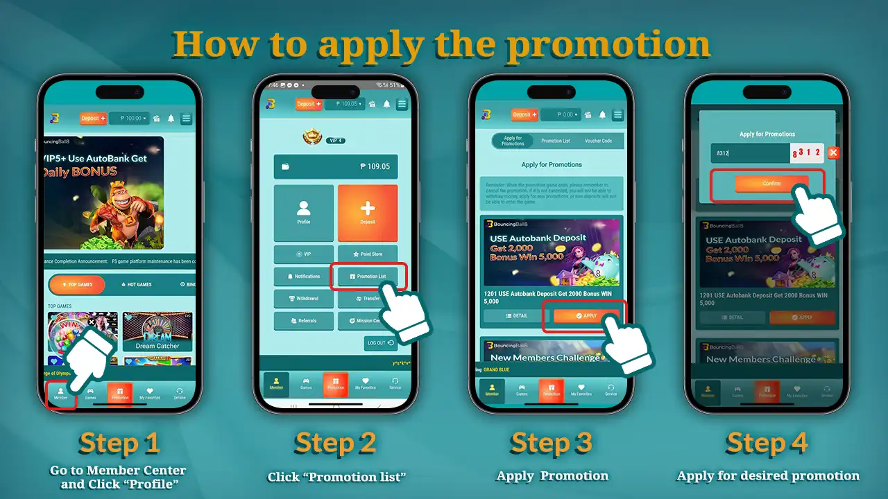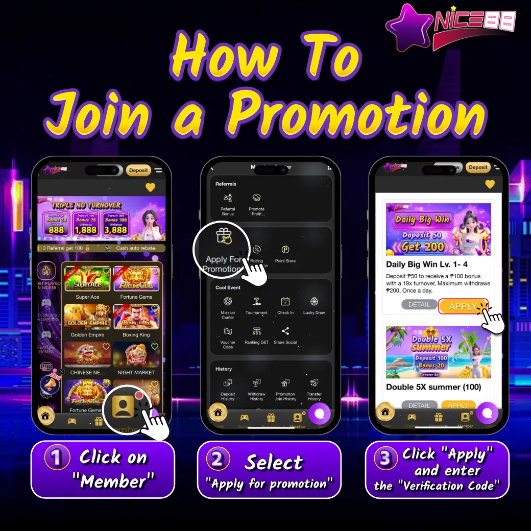 2. Go to Website / APP >> Member Center >> Promosyon List >> Apply for Promotions >> Click to apply for desired promotion.