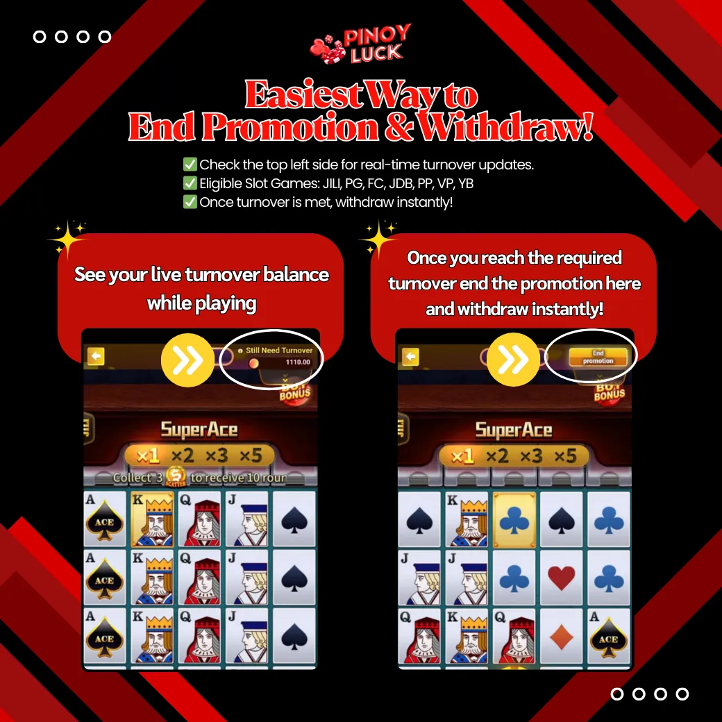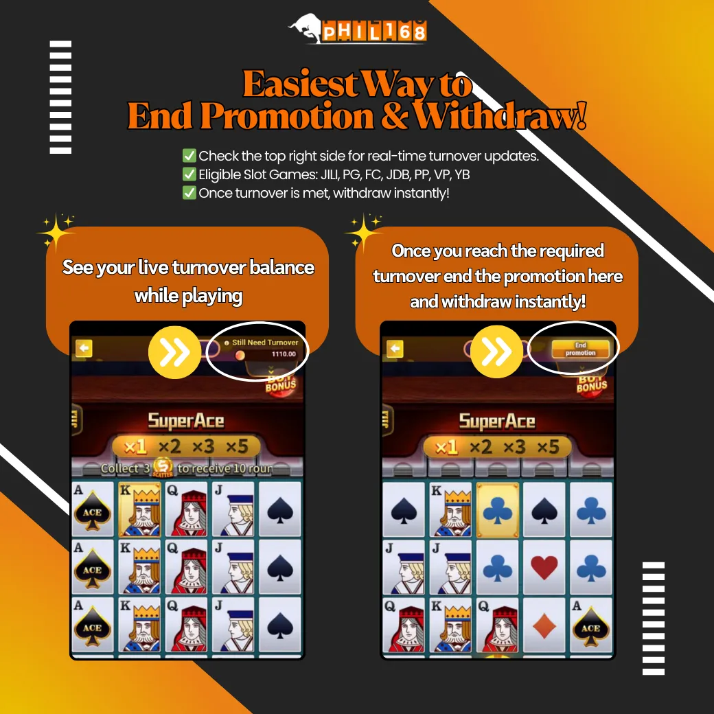 • To exit the promotion and withdraw, you must meet the required turnover or have a credit balance of less than 5 PHP.