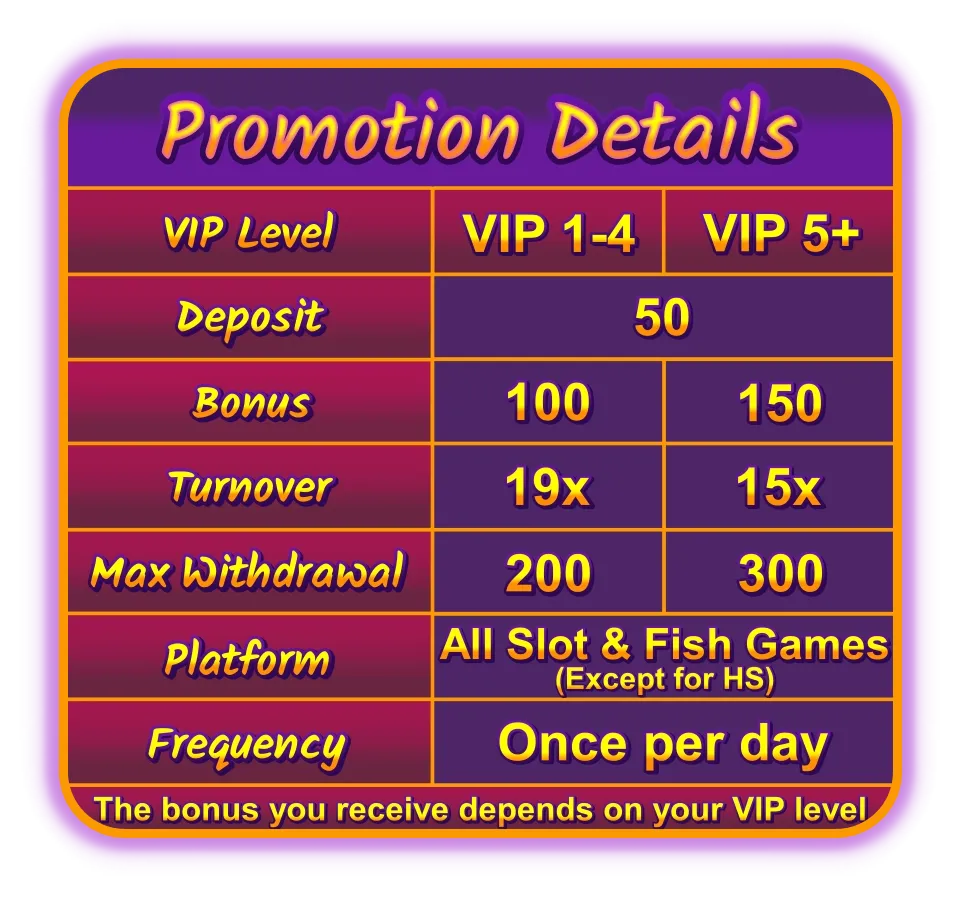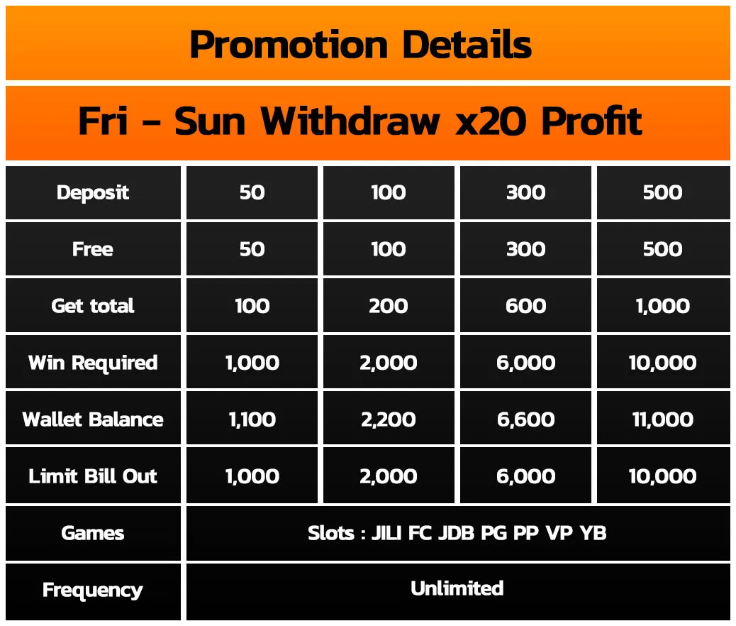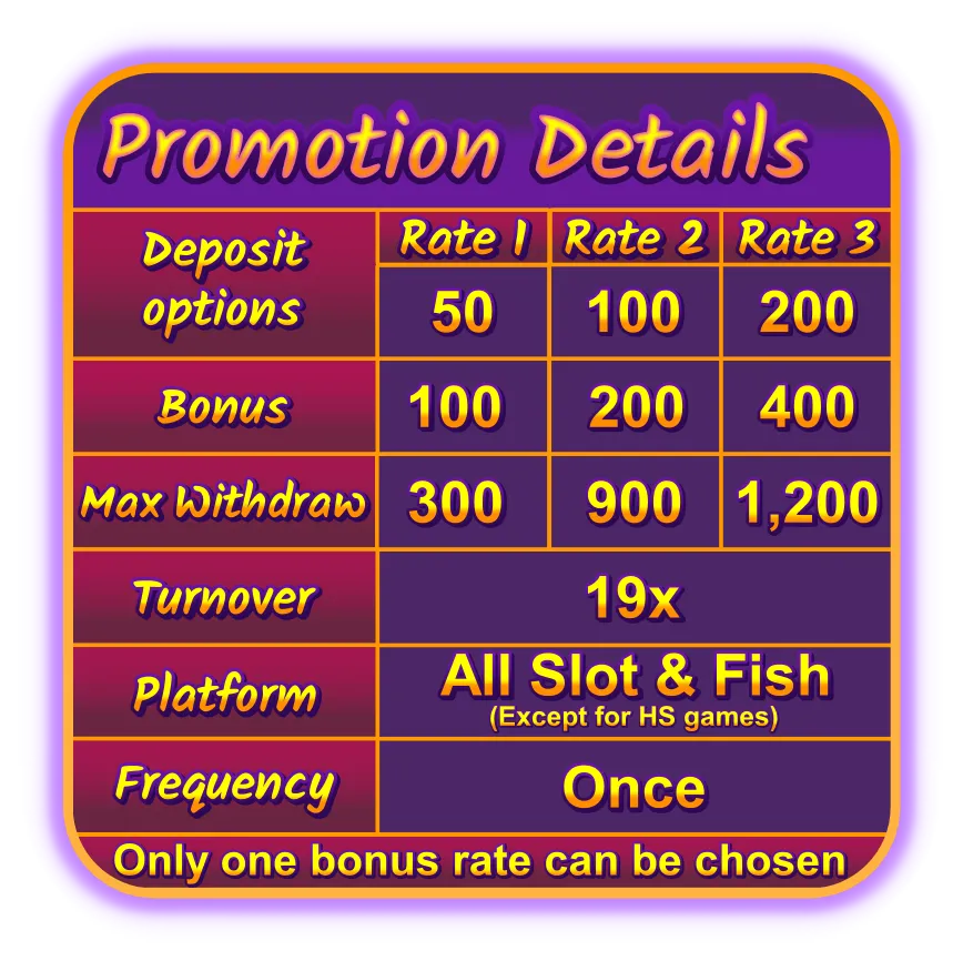 • Promotion applies to Slot & Fishing games on all platforms (excluding PG, YGG, HS games and Candy Baby on the JILI platform).