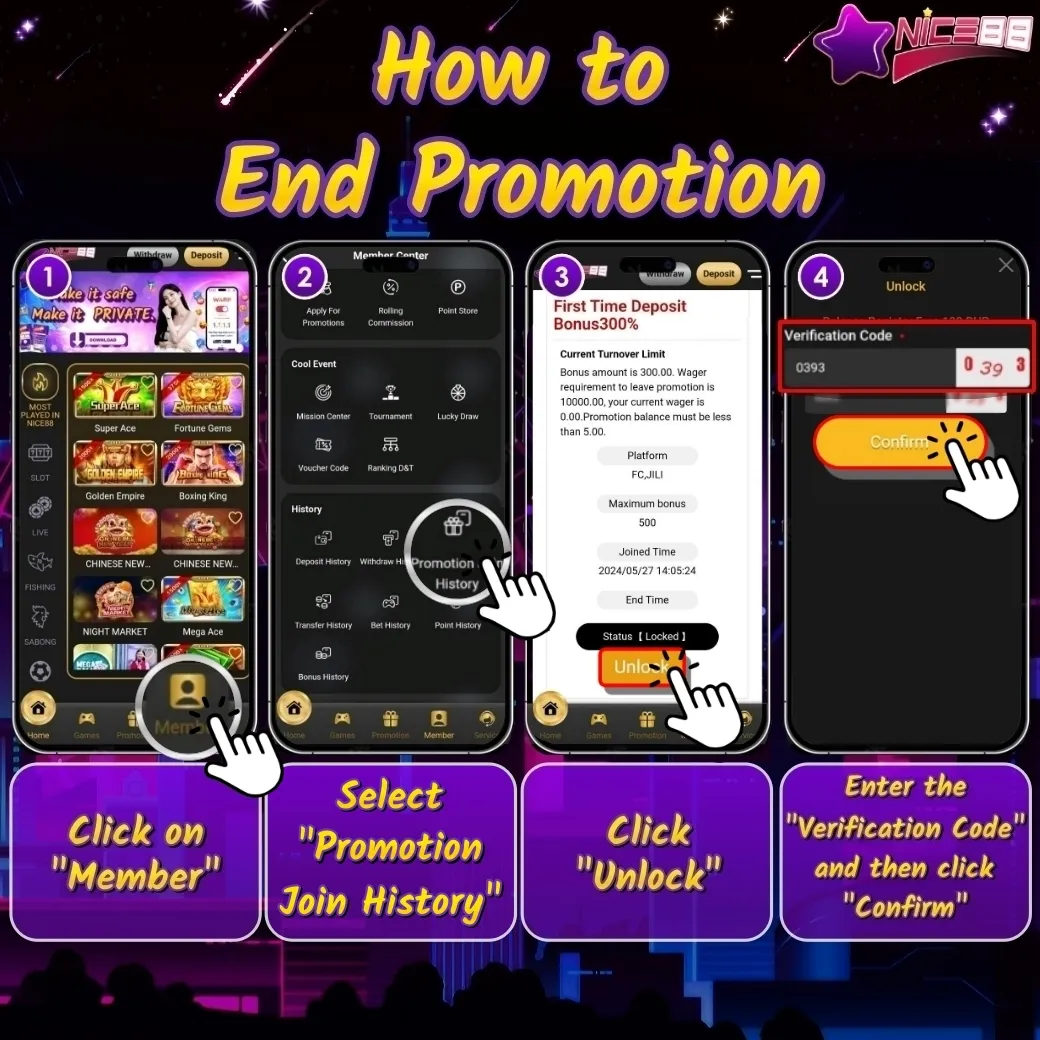 • Click >> ‘Promotion Join History’ << select ‘Unlock’ enter the ‘Verification Code’ and wait 3-5 minutes for approval.