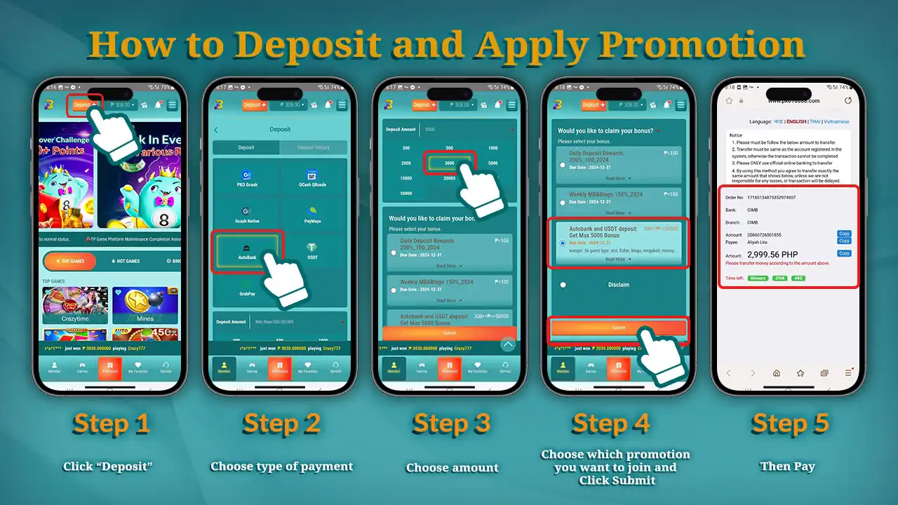 • Members need to have accumulaterd deposit of ₱100, 300, 500, 1,000 and claim the promotion via APP.