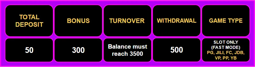 • A deposit of PHP 50 will result in a credit of PHP 50 in the form of a bonus.