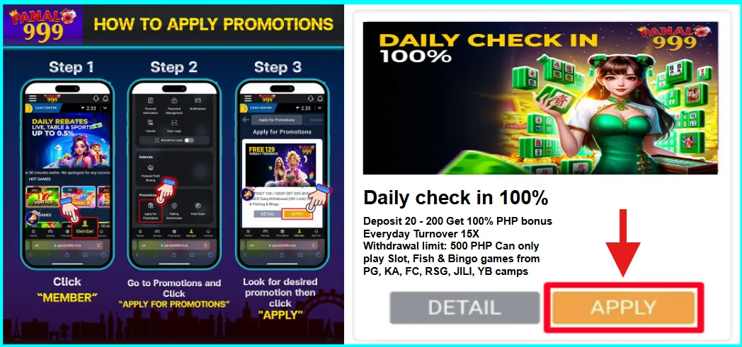 • Click ‘Member’ >> Choose ‘Promotion List’ >> Choose ‘Daily Big Win’ >> Click ‘Apply Promotion’.